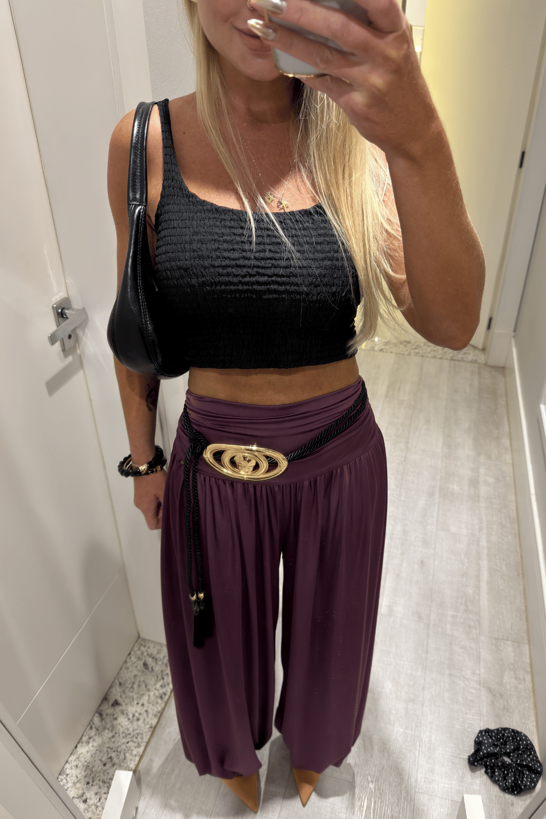 Top curto preto com alças, franzido e com forro. É uma peça versáril para compor looks causais em diferentes estilos.