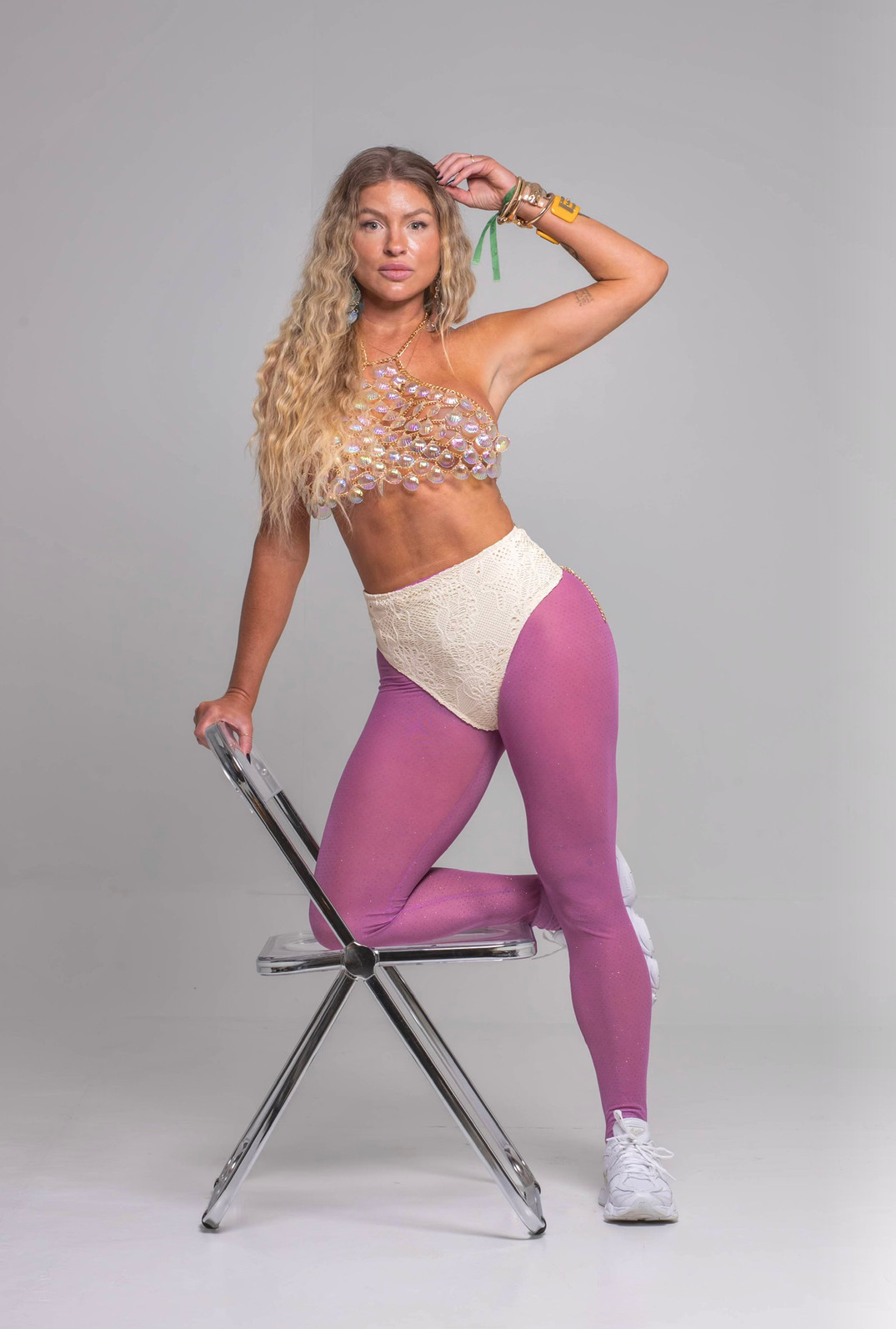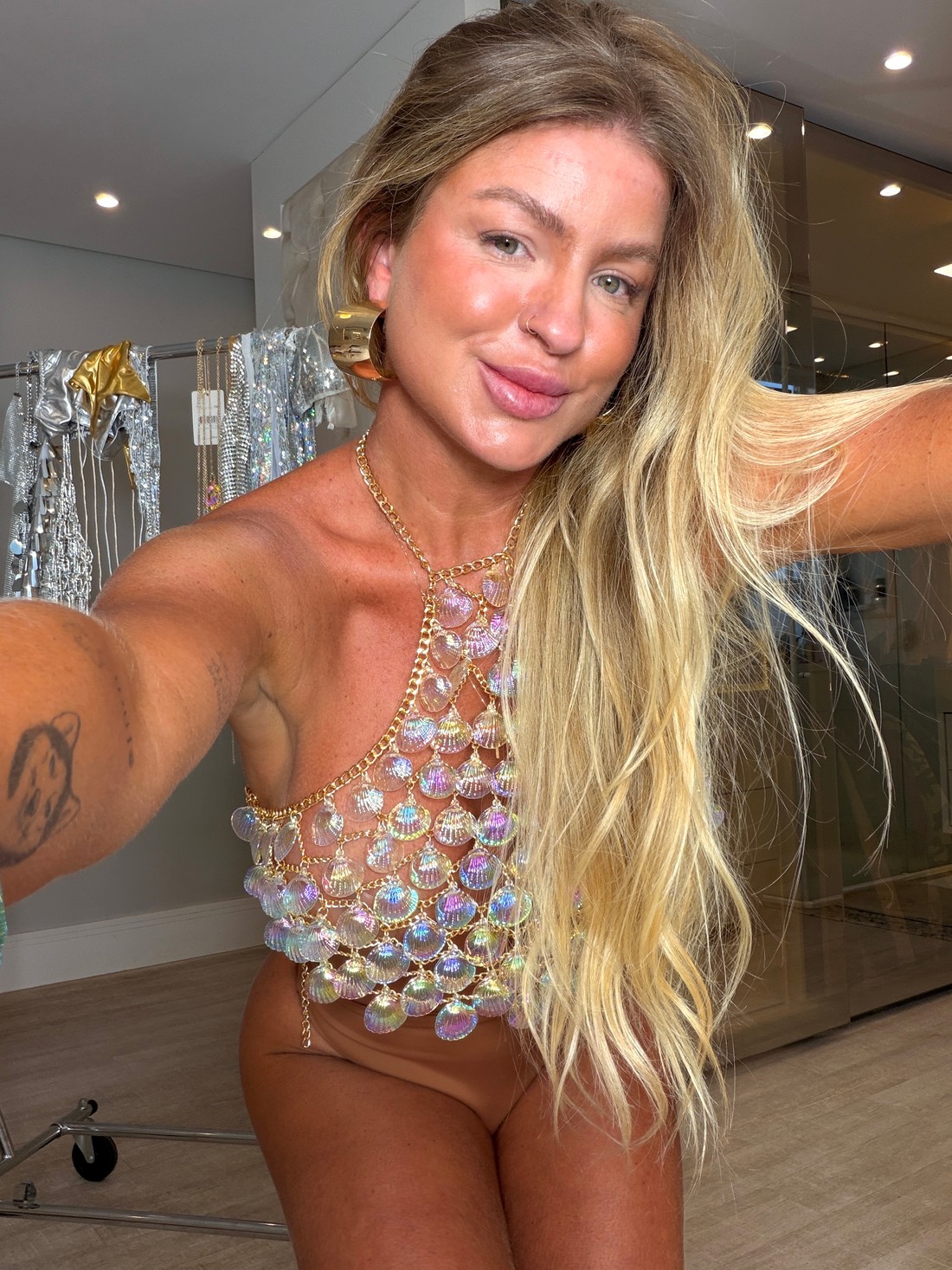 Top frente única com aplicações de pedraria, possui fecho de corrente para melhor ajuste na hora de vestir . Peça única e com um toque de brilho