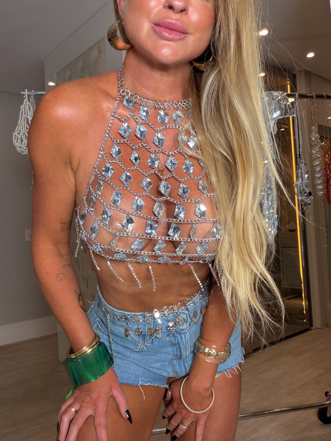 Top frente única com aplicações de pedraria, possui fecho de corrente para melhor ajuste na hora de vestir . Peça única e com um toque de brilho