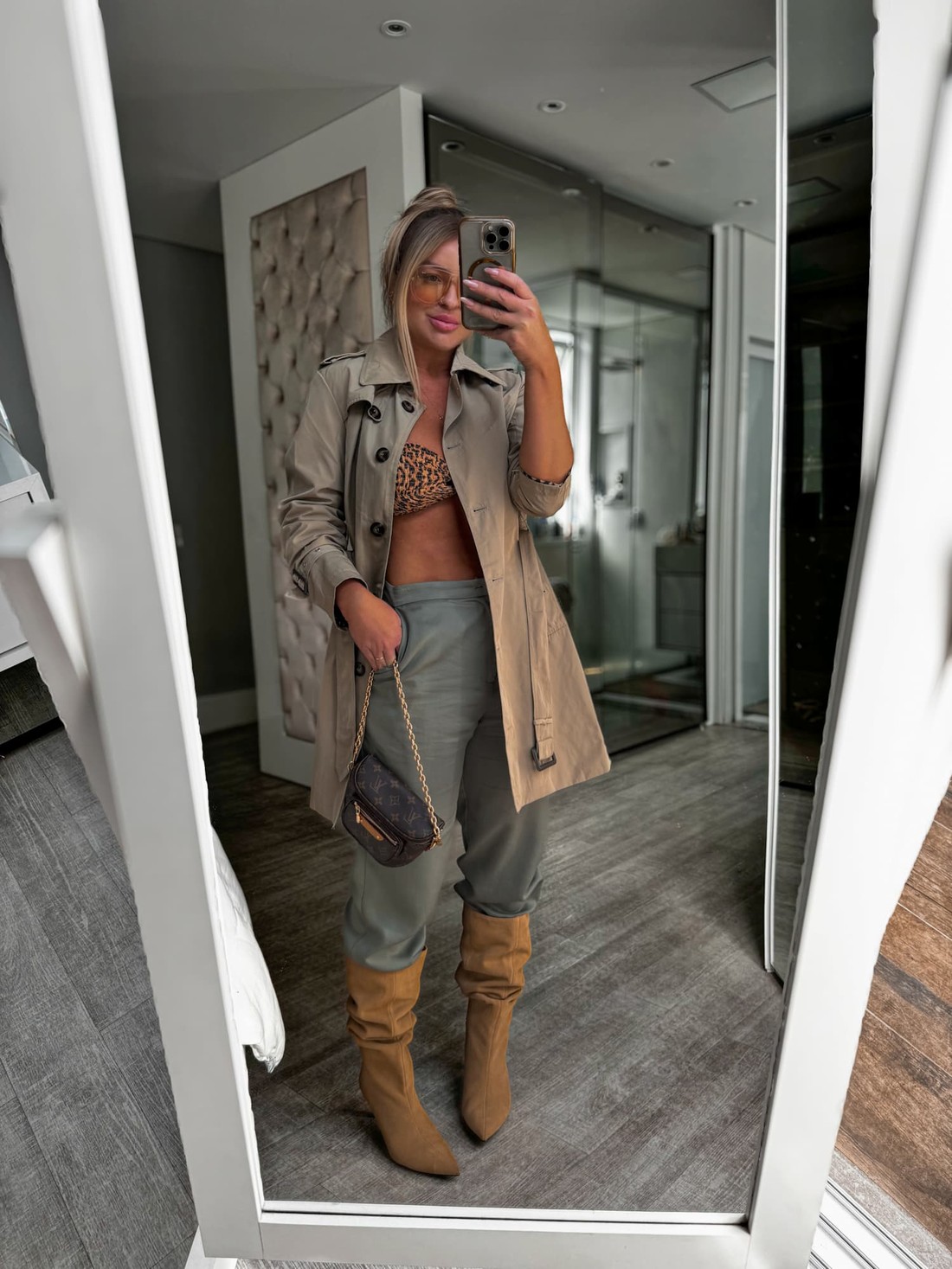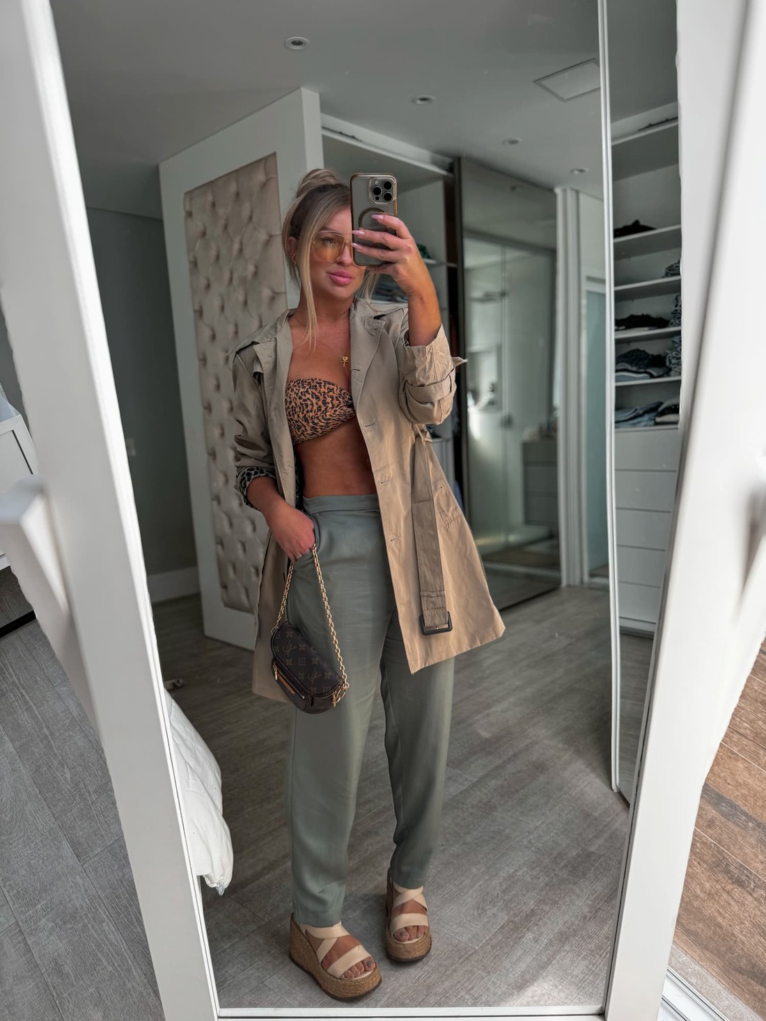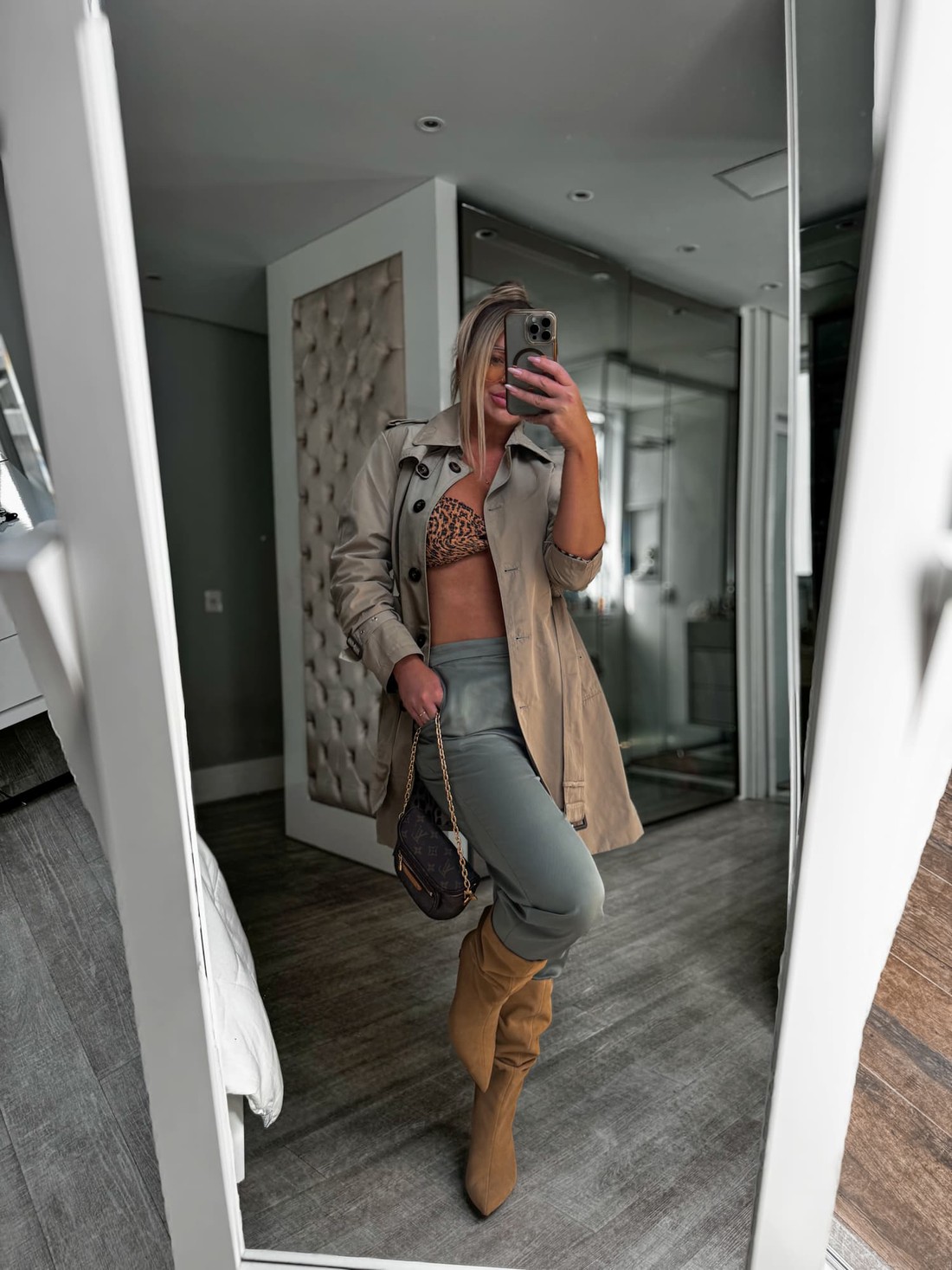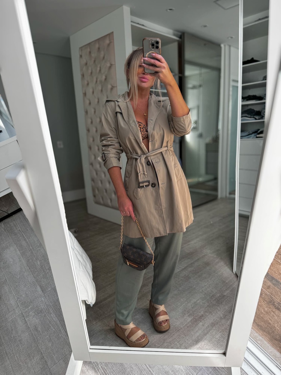 Trench coat alongado possui gola, bolsos funcionais, abotoamento frontal, cinto com fivela na cintura e presilhas nos ombros e punhos. É uma peça intemporal, uma aposta perfeita para a meia estação.