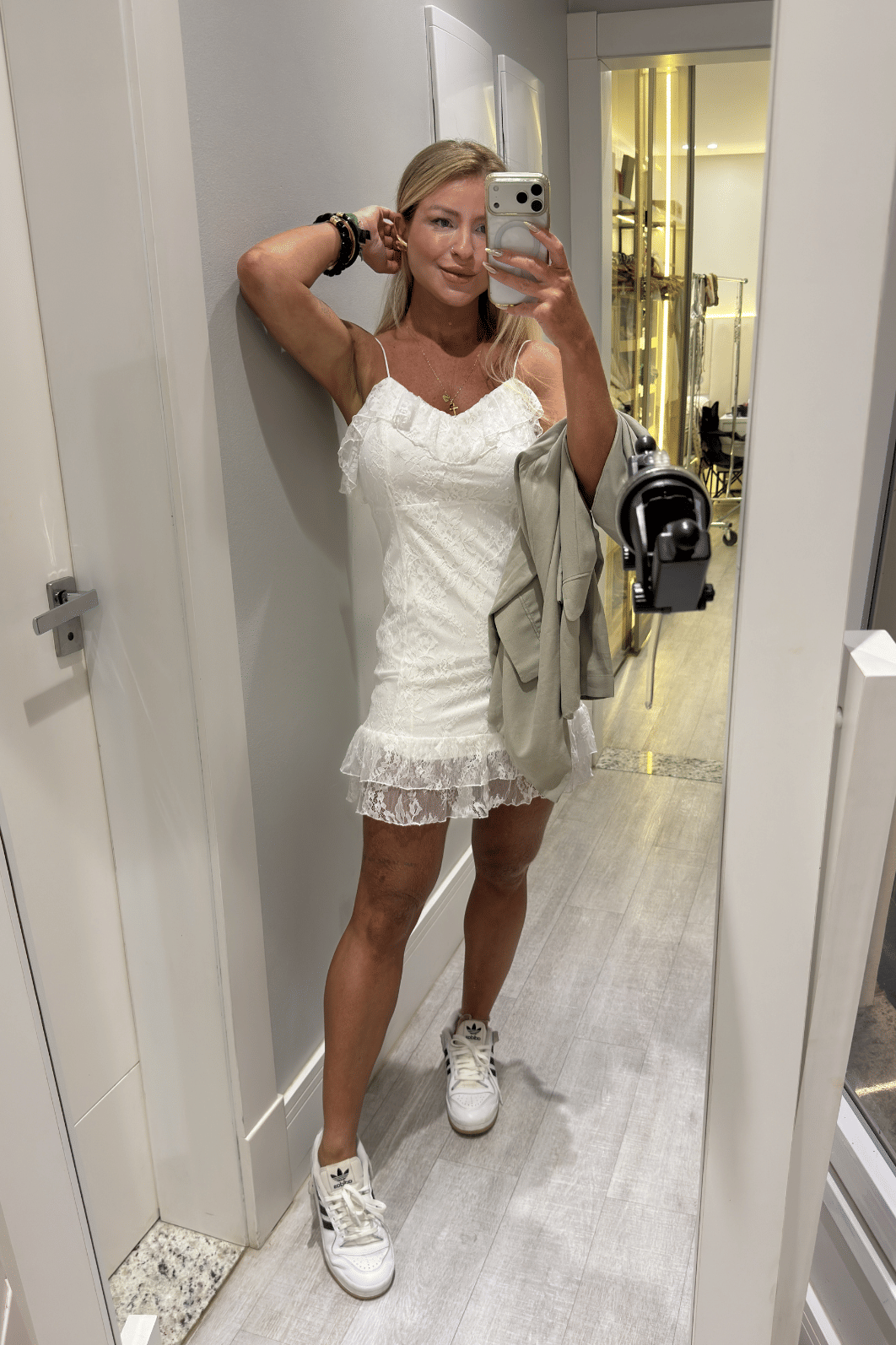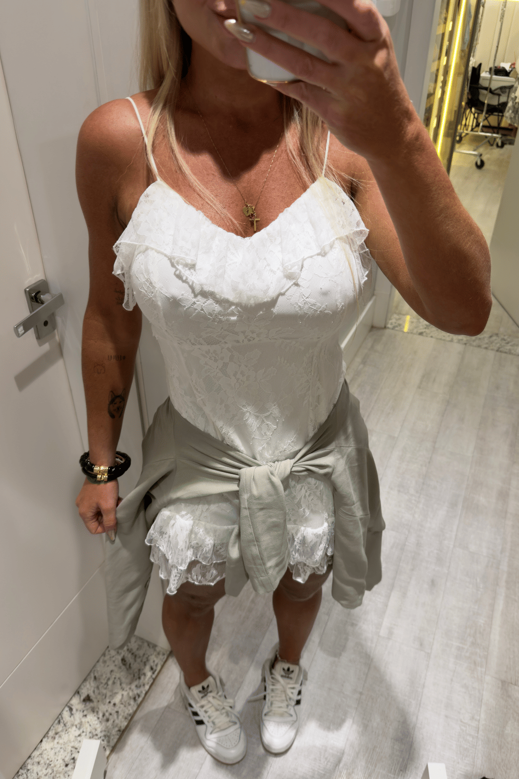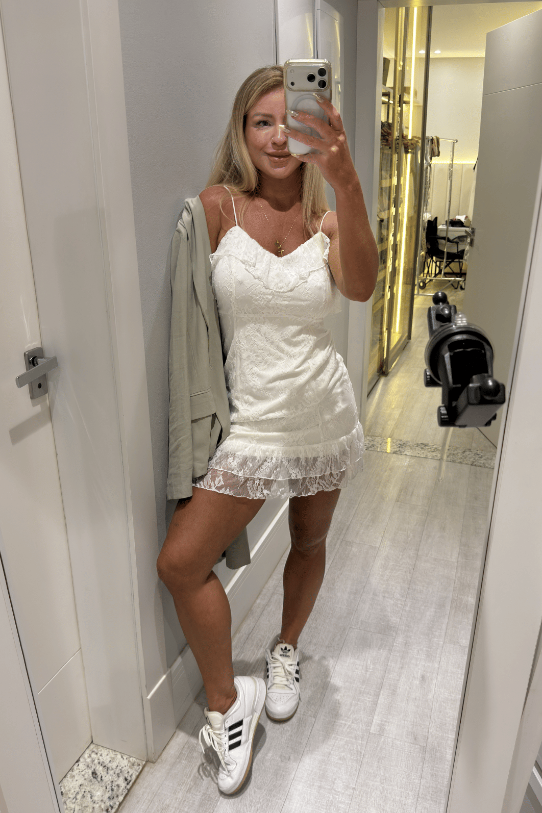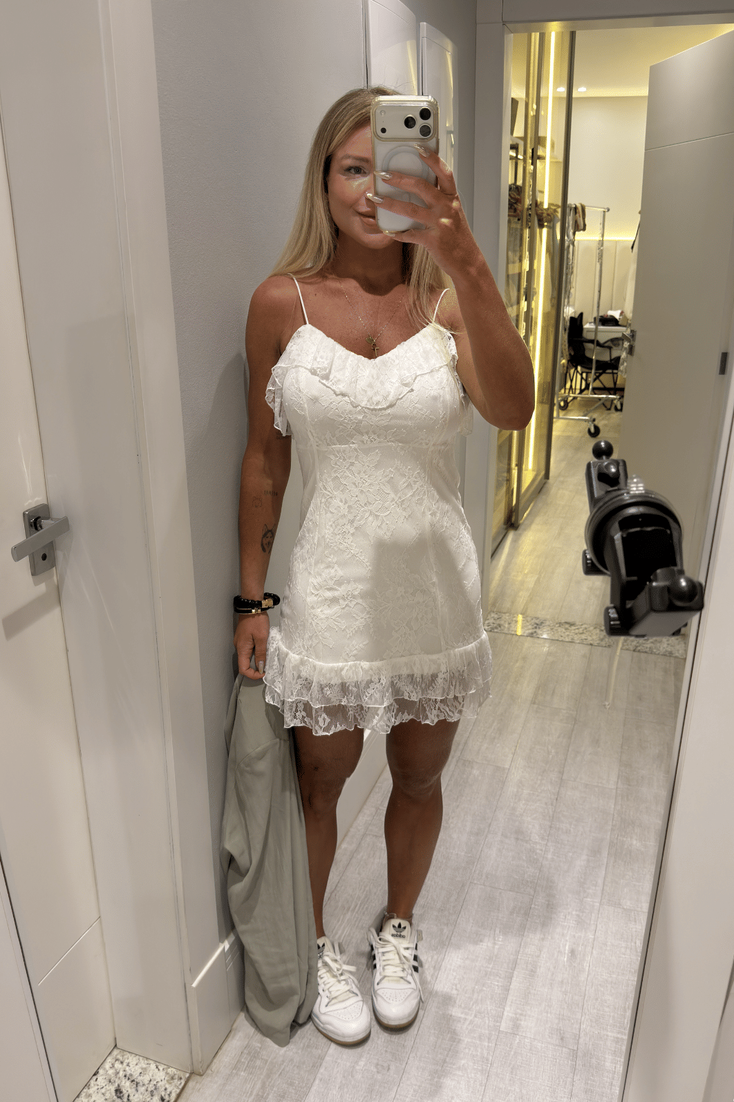 Vestido curto com renda e babados em estilo romantico com influência boho chic. A renda com motivo floral, os babados e a leveza da modelagem remetem a um visual feminino, delicado e um pouco praiano/casual. Apresenta alças finas em estilo delicado.