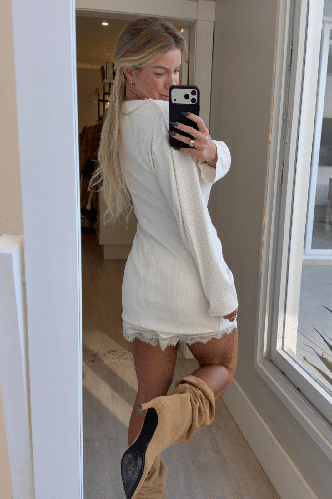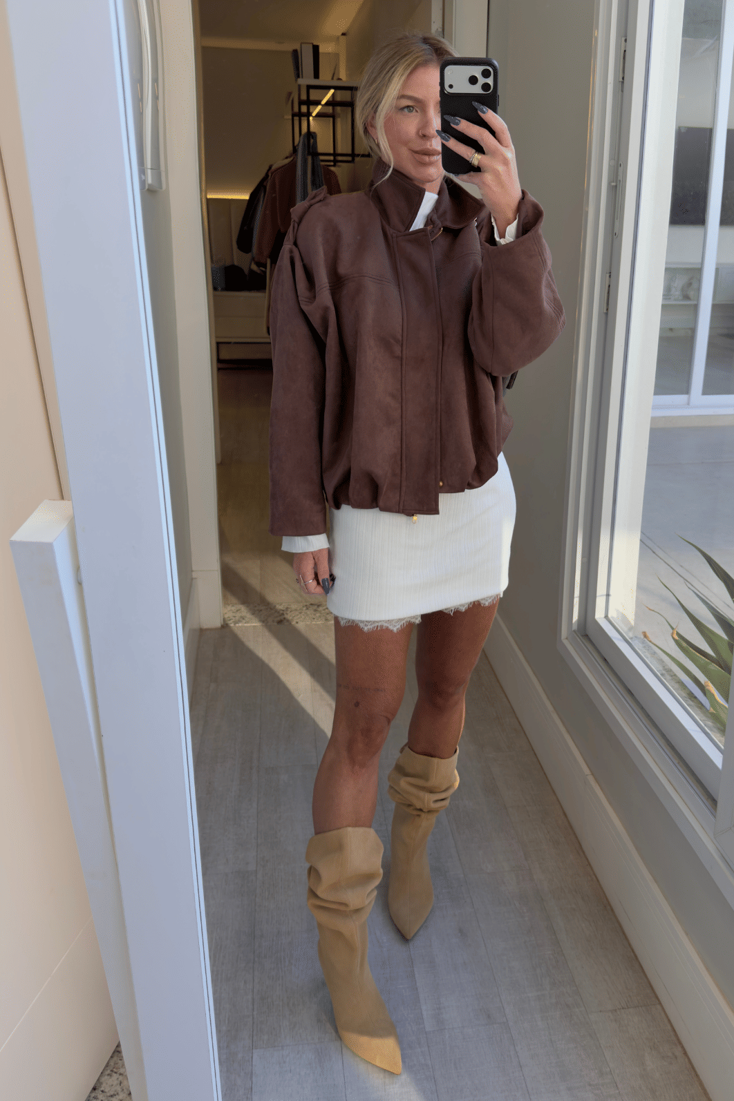 Vestido de mangas longas confeccionado em tecido com textura . uma peça que fica muito bem em composições com jaquetas e casacos no inverno,