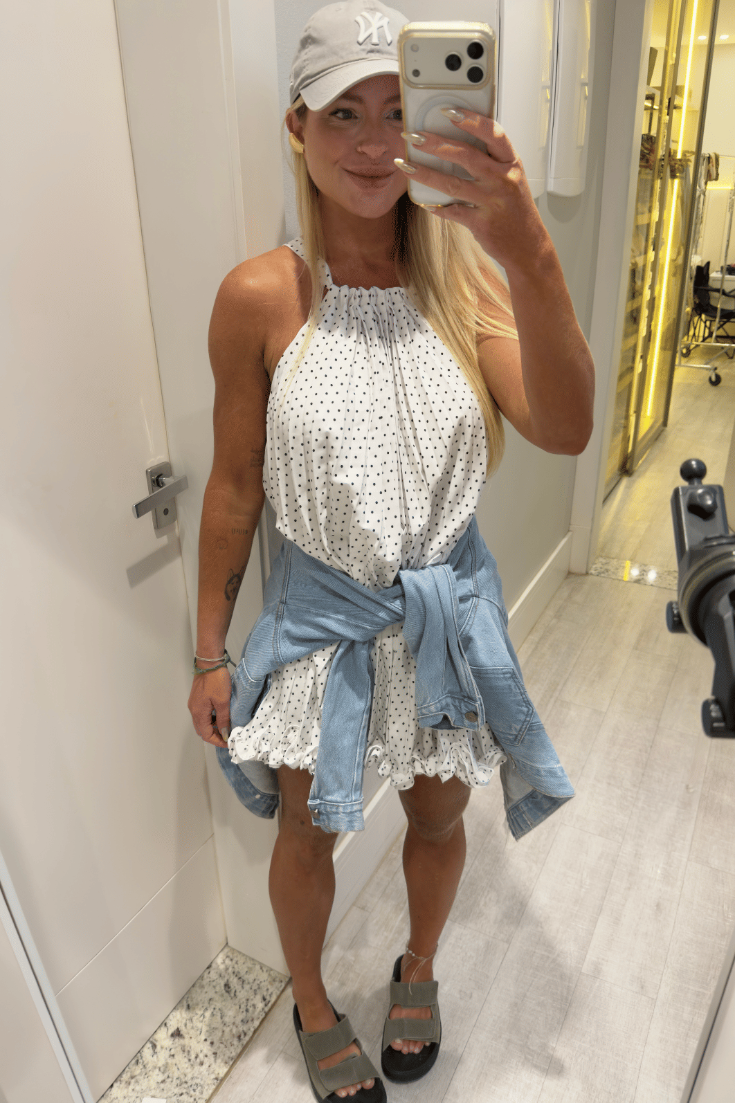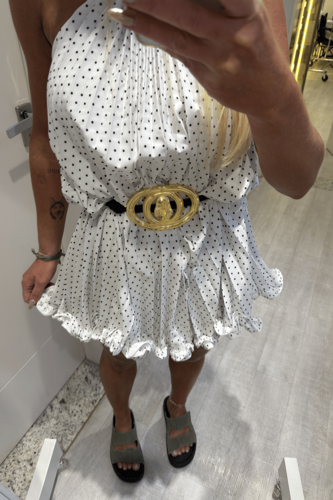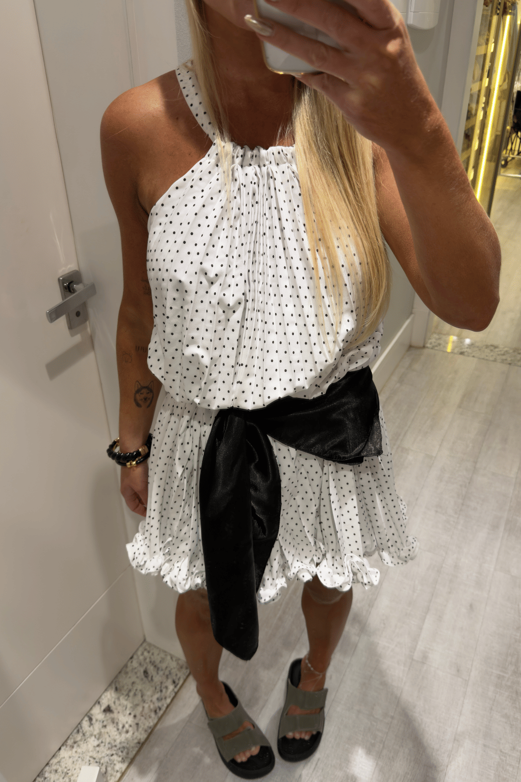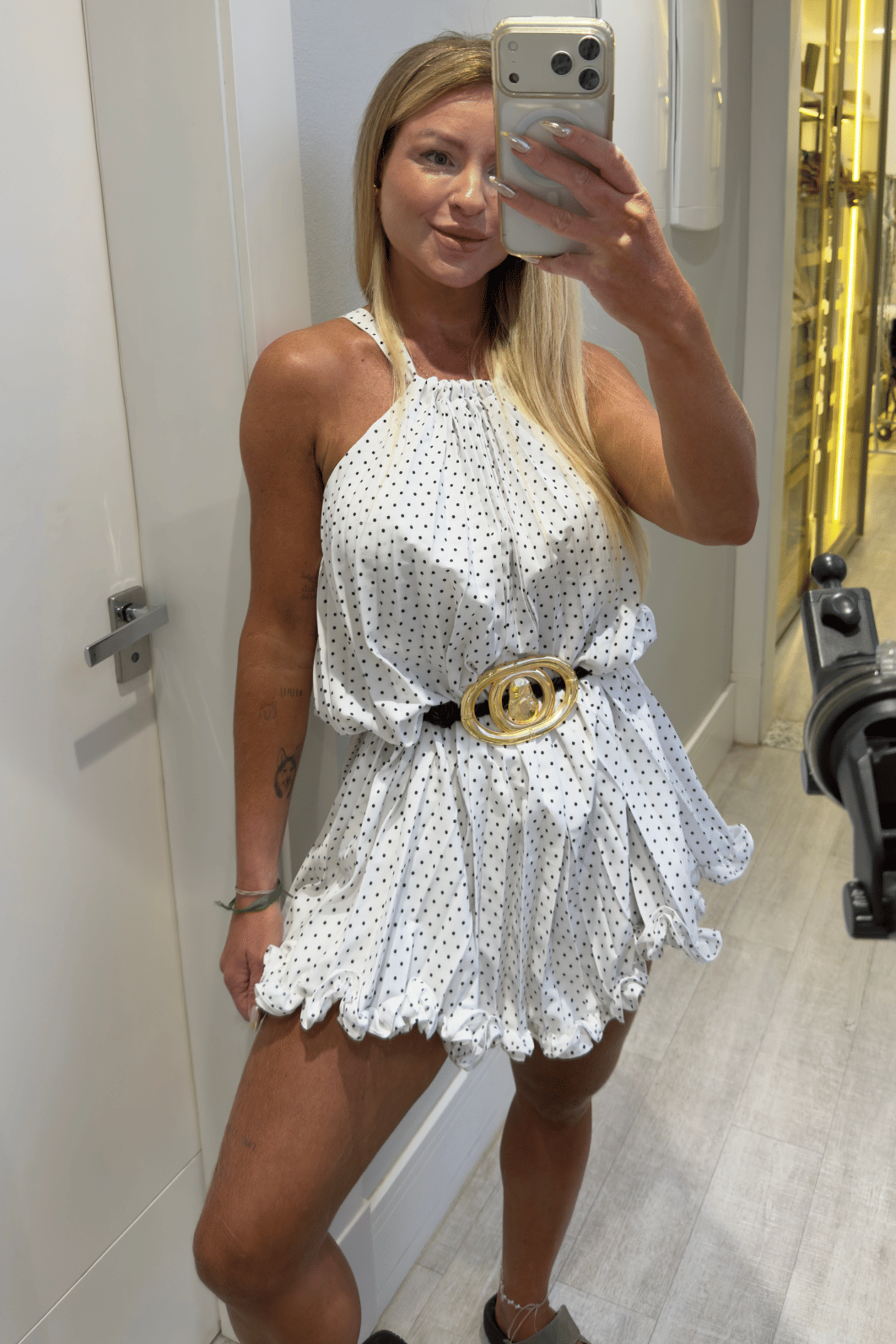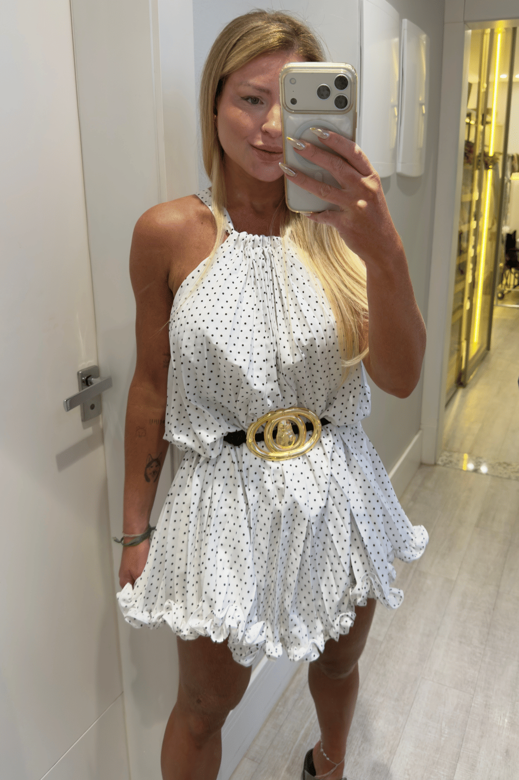 Vestido curto plissado branco com detalhes em babados na barra e estampa poá (bolinhas pretas). Possui amarração na parte de trás do pescoço para melhor ajuste na hora de vestir. O tecido é leve e fluido. Essa é a combinação perfeita para quem busca charme, tendencia, atemporalidade e elegância.