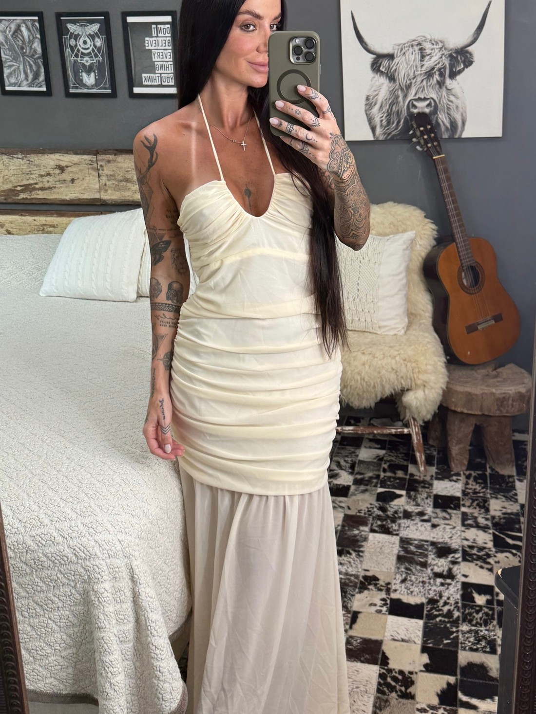 Vestido de comprimento longo , com alças finas em amarração e detalhes drapeado , confeccionado em tule . Peça cheia de estilo para arrasar em
