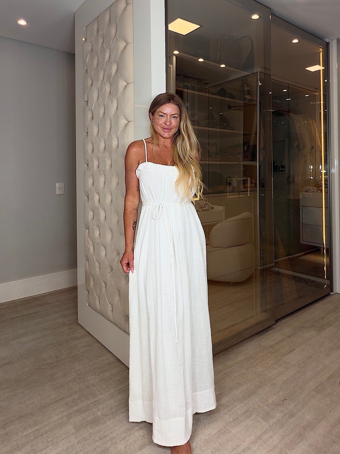 Vestido de comprimento longo , com alças reguláveis , e detalhe e amarração , confeccionado em crepe. vestido com tom elegante e minimalista!