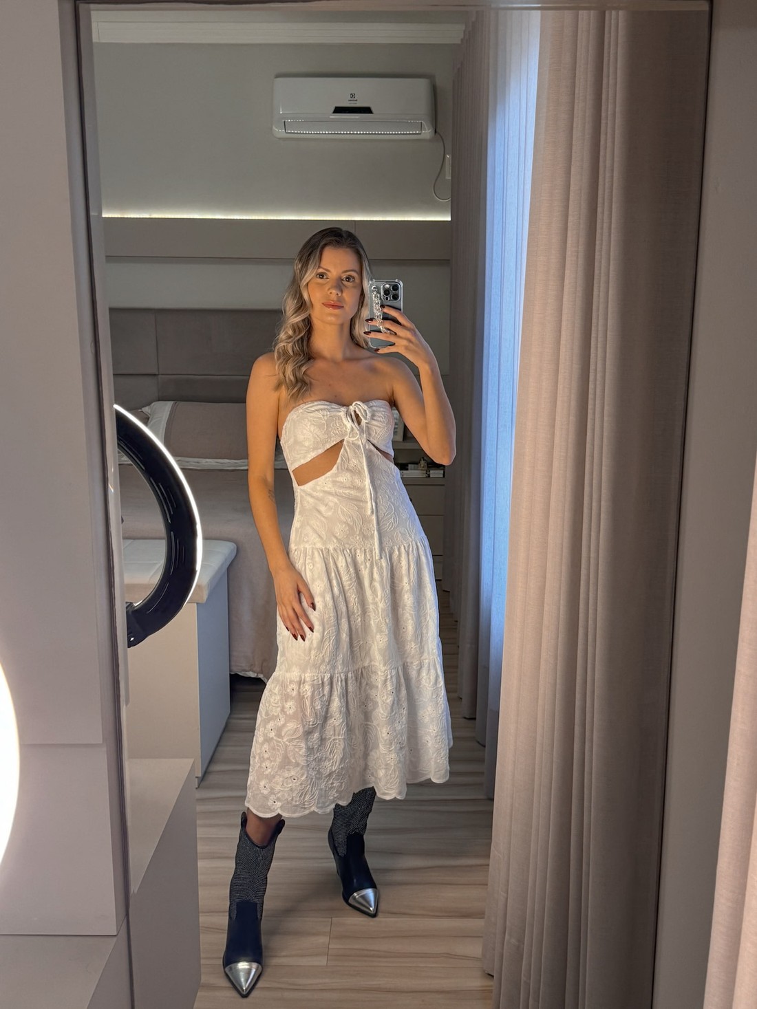 Vestido midi tomara que caia em laise com amarração e recorte frontal. Possui fechamento nas costas em zíper e barra godê. Peça charmosa, delicada e elegante para você arrasar em seus eventos do dia.